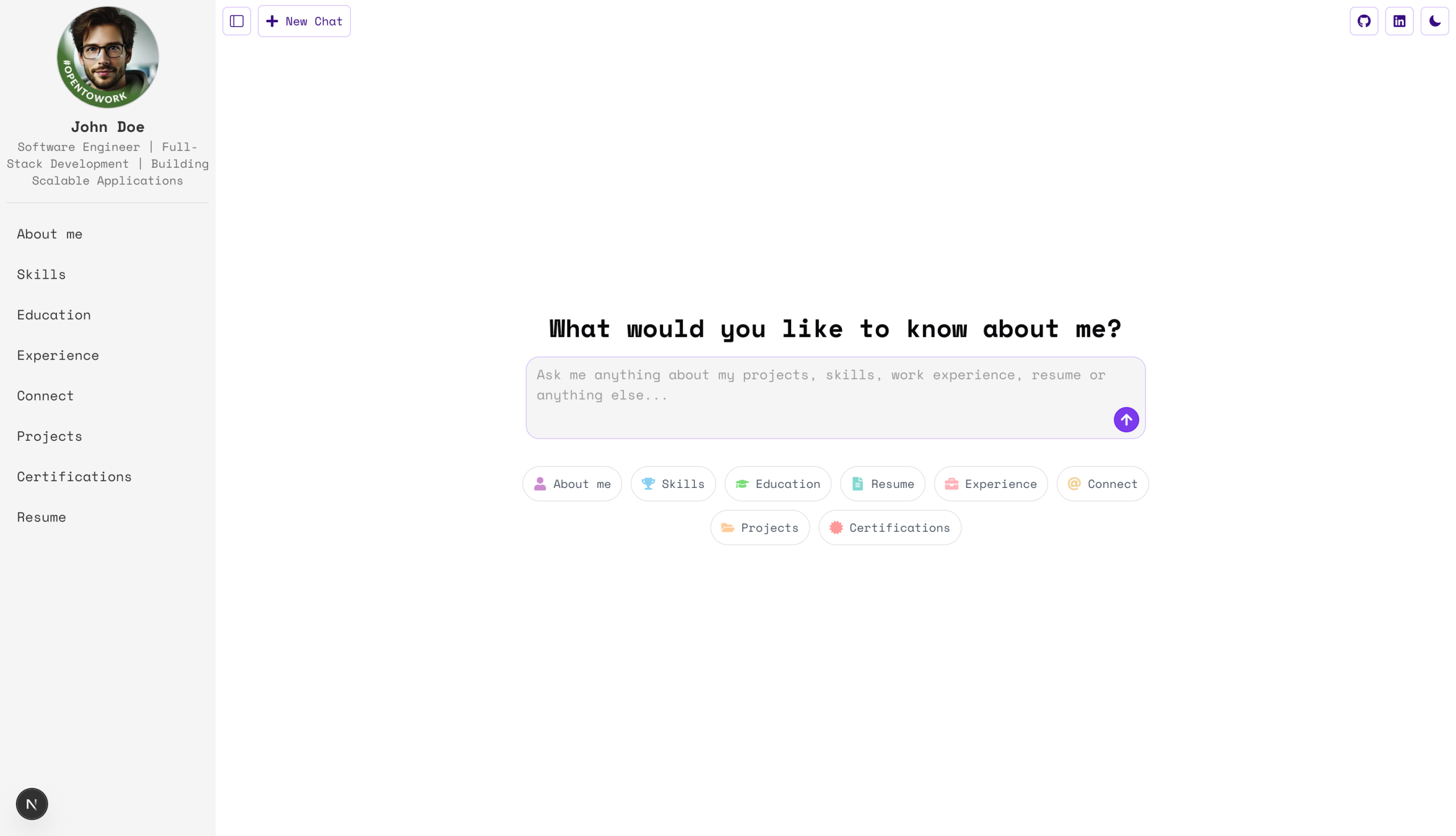 A modern, AI-powered portfolio where visitors can chat to explore your skills, projects, and professional journey, built with Next.js & Vercel AI SDK.