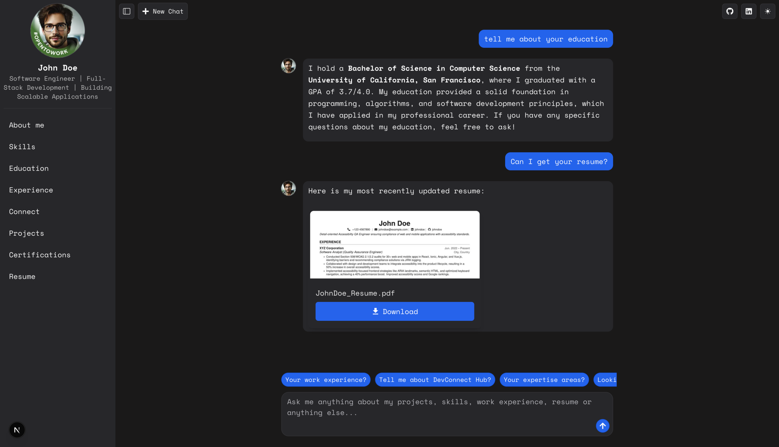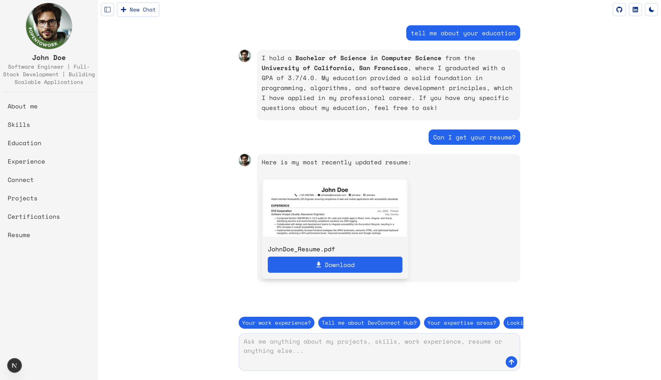Instead of static pages, ChatFolio AI engages visitors through conversation, showcasing your work, experience, and tools interactively and effortlessly.