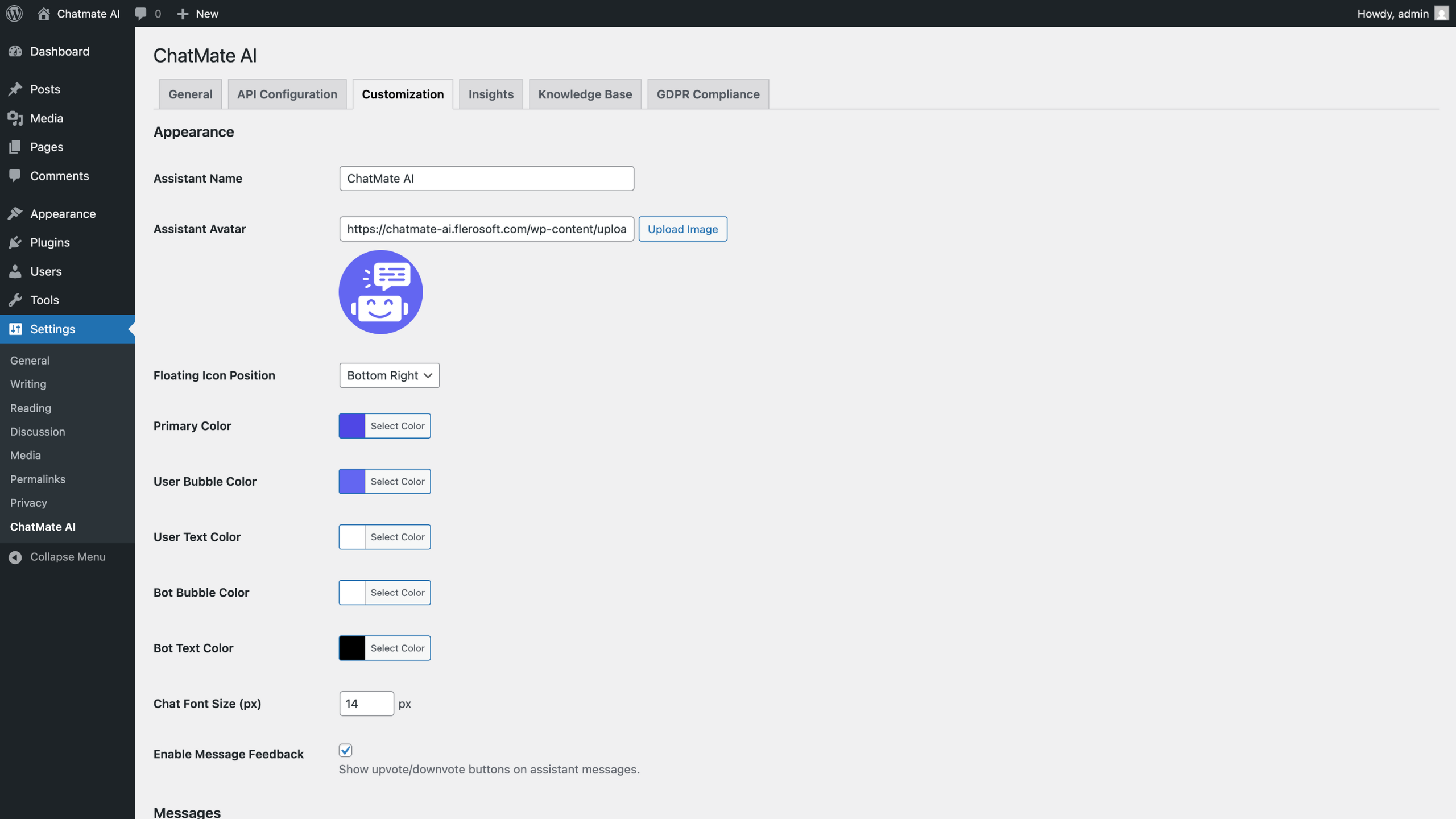 - Message Feedback: Enable/disable upvote/downvote buttons.